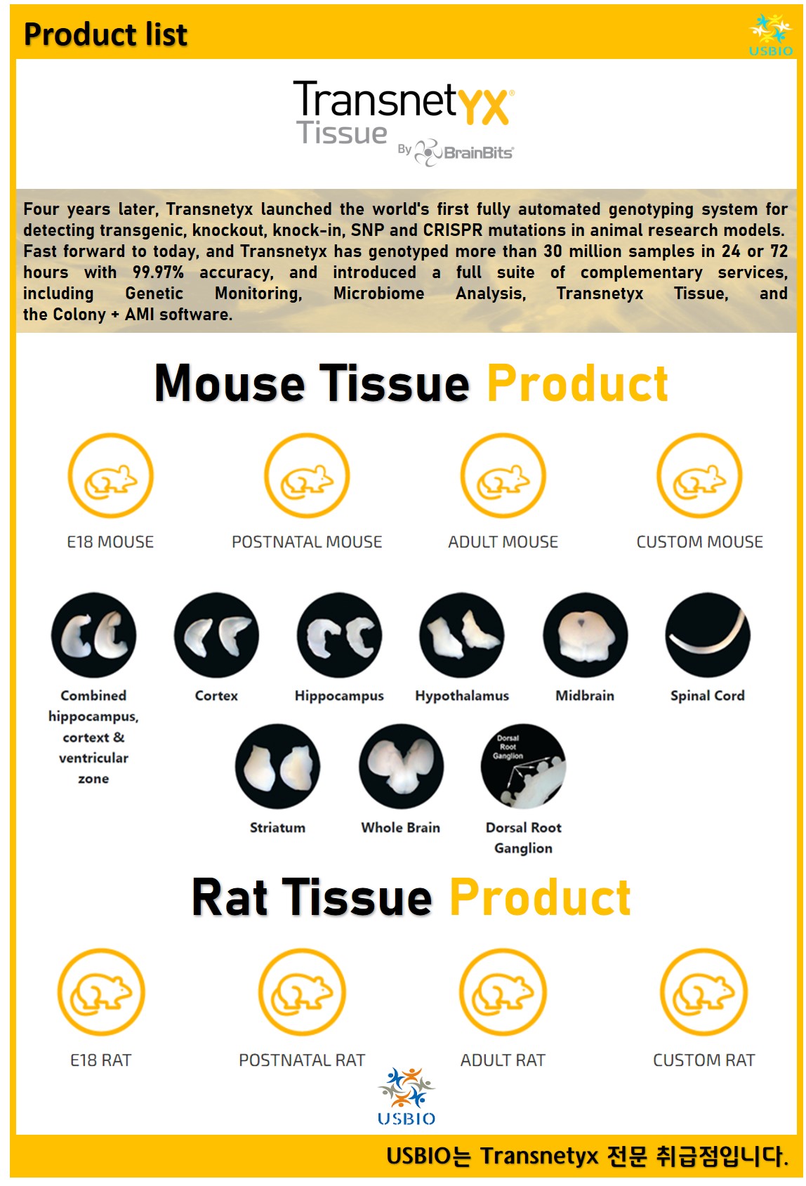Transnetyx는 동물 연구 모델에서 유전자 변형, knockout, knock-in, SNP 및 CRISPR 동물 연구 모델에서 돌연변이를 검출하기 위한 세계 최초의 완전 자동화 된 유전 시스템을 출시한 회사이며, 세계 연구자들에게 가장 효율적인 발견 경로를 제공하고 바이오의학 연구자들에게 더 빠르고, 쉽고, 더 정확한 결과를 제공하기 위한 기술과 과정을 보유하고 있습니다. Transnetyx는 99.97%의 정확도로 24시간 또는 72시간 동안 3천만 개 이상의 샘플을 유전형화했으며 유전자 모니터링, 마이크로바이옴 분석, Transnetyx 조직 및 Colony + AMI 소프트웨어를 포함한 전체 보완 서비스 제품군을 도입 했습니다. Transnetyx는 과학자들이 빠르고 쉽고 정확한 유전형 분석 서비스를 통해 연구를 가속화할 수 있도록 노력하고 있습니다.