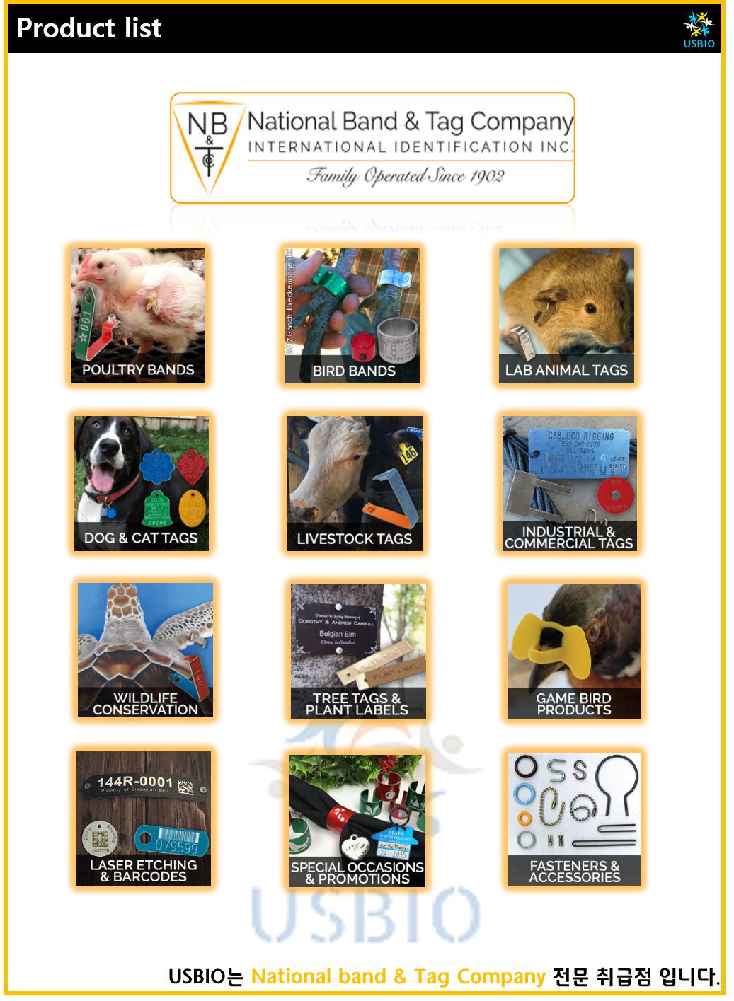 다수의 대리점을 보유하고 있는 어스바이오는 National Band & Tag 전문 취급접입니다.