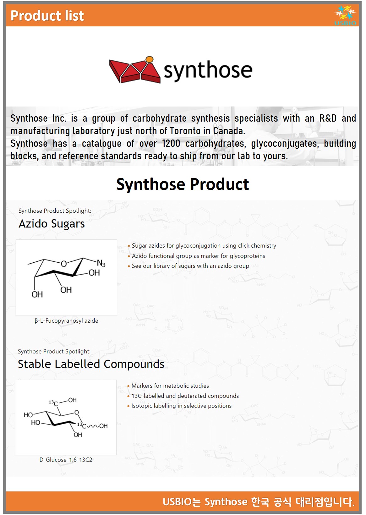 Synthose는 캐나다 토론토 북쪽에 R&D 및 제조 연구소가 있는 탄수화물 합성 전문가 그룹입니다. Synthose에서 제공하고 있는 제품 카테고리로는 Monosaccharides(단당류), Disaccharides(이당류), Oligosaccharides(올리고당), Glycosides(글리코 사이드) 등이 있으며 수백 가지의 탄수화물과 글리코 접합체, 합성 빌딩 블록, 생화학 물질을 공급하고 있습니다. 이외 Synthose는 맞춤형 합성 서비도 제공하고 있고 Synthose의 연구실에는 10개의 흄 후드가 장착되어 있어 80L 반응기와 20L 증발기에서 밀리그램 규모에서 킬로그램 규모까지 합성 프로젝트를 수용할 수 있습니다.
