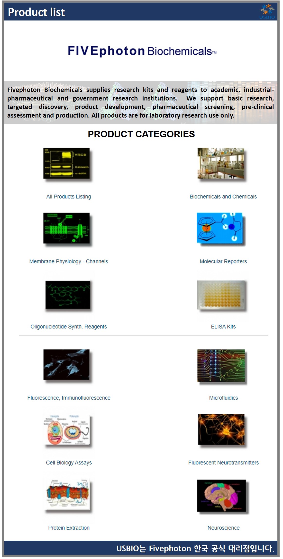 Fivephoton Biochemicals은 학술, 산업 의약품 및 정부 연구 기관에 연구 키트 및 시약을 공급하고 있으며 기초 연구, 표적 발견, 제품 개발, 제약 심사, 임상 전 평가 및 생산을 지원하고 있습니다. Fivephoton의 제품 카테고리로는 Biochemicals and Chemicals, Fluorescence, Immunofluorescence, Microfluidics, Membrane Physiology( Channels), Molecular Reporters, Cell Biology Assays, Fluorescent Neurotransmitters, Oligonucleotide Synth. Reagents, ELISA Kits, Protein Extraction, Neuroscience등이 있으며 간략하게 면역 형광 표지 키트, 면역 분석, ELISA 키트, 세포 신호 검출 키트, 전사 인자 활성화 분석, 분자 리포터, 전기 화학 바이오 센서, 단백질 추출 시약, DNA 분리 키트, 형질 주입 시약 및 형광 리간드 등을 공급하고 있습니다.