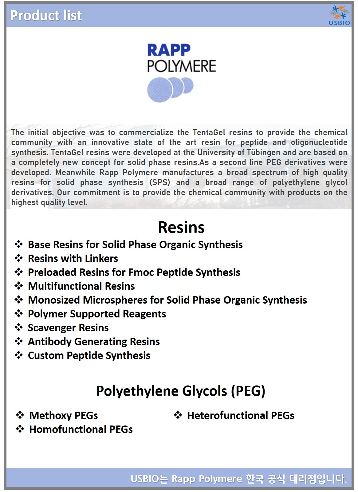 Rapp Polymere는 1988년 Tuebingen 대학과 밀접한 관계를 가진 민간 기업으로 최초 설립되었으며 이후 유한책임회사가 되었습니다. 초기 목표는 TentaGel 수지를 상품화하여 화학계에 펩타이드와 올리고뉴클레오티드 합성을 위한 혁신적인 최첨단 수지를 제공하는 것이었습니다. TentaGel 수지는 Tübingen 대학에서 개발되었으며 완전히 새로운 개념의 고체상 수지를 기반으로 합니다. 두 번째 라인으로 PEG 파생 모델이 개발되었습니다. 이외에 Rapp Polymere는 고상합성(SPS) 및 광범위한 폴리에틸렌 글리콜 유도체를 위한 광범위한 고품질 레진을 생산하고 있습니다.