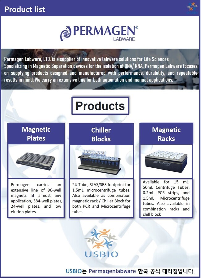 Permagen Labware은 생명과학 시장에 고부가가치 제품을 내놓는데 주력하는 기업으로 DNA, RNA 등의 분리를 위한 마그네틱 비드 분리 장치를 전문으로 하고 있습니다.