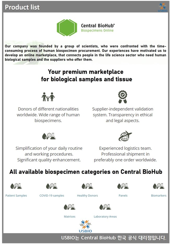 Central BioHub는 인체 생체 표본 조달 과정에 시간이 많이 걸린다는 문제에서 착안하여 인간의 생물학적 샘플이 필요한 생명과학 분야의 사람들과 이를 제공하는 공급업체를 연결하는 온라인 시장 개발을 위해 설립되었습니다. Central BioHub는 800,000 + 이상의 활성 인간 생물학적 샘플을 보유한 인간 생물 표본의 가장 큰 온라인을 구축하였고 시장 연구 샘플을 클릭 한 번으로 여러 공급업체의 검수 프로세스와 생체 표본 가용성을 통합하여 확인할 수 있는 디지털 플랫폼을 제공하고 있습니다.