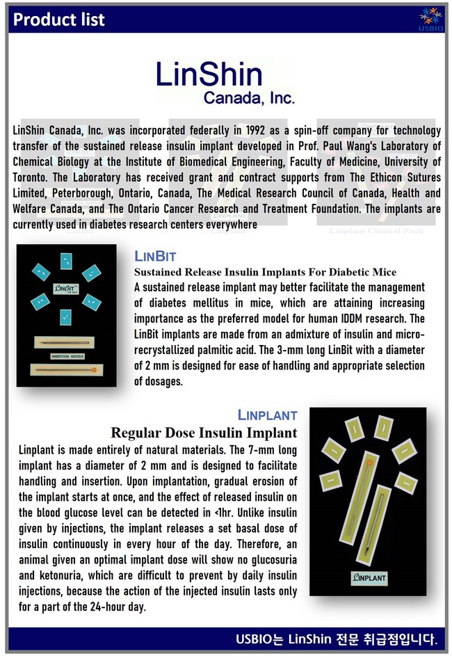 LinShin Canada Inc는 토론토 대학교 의과대학 의생명공학연구소의 폴 왕 교수 화학생물학 연구실에서 개발한 서방형 인슐린 임플란트(Insulin Implant)의 기술 이전을 위해 1992년 연방 정부에 설립한 회사로 당뇨병 연구 개발 지원 및 지속적으로 방출되는 인슐린 임플란트(Insulin Implant) 제조 및 공급을 하고 있습니다.