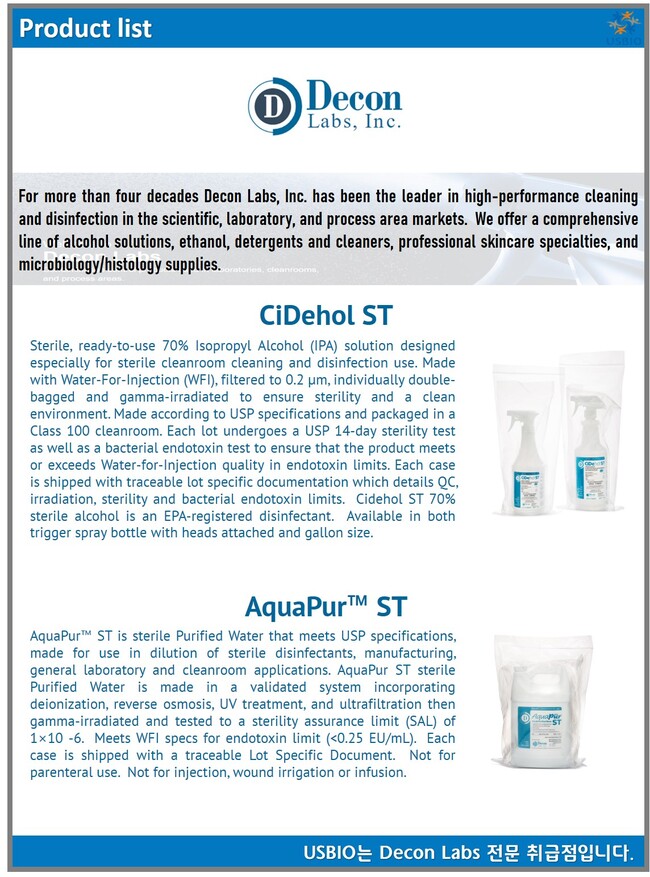 Decon Labs는 고객들의 실험실 및 의료 환경에서의 요구에 맞춰 다양한 솔루션을 제공하고 있으며, 이를 통해 안전하고 깨끗한 작업환경을 유지하는 데 기여하고 있습니다.