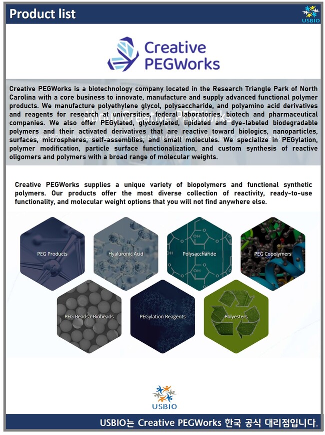 Creative PEGWorks는 낮은 다분산성, 높은 반응성 및 고순도의 고품질 폴리(에틸렌글리콜) PEG 제품을 공급하는 생명 공학 회사로 폴리에틸렌 글리콜, 다당류, 폴리 아미노산 유도체 및 시약을 대학, 연방 실험실, 생명 공학 및 제약 회사의 연구에 사용하도록 제조하고 있습니다.
