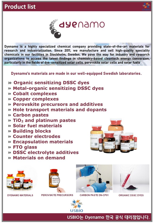 또 페로브스카이트 및 저전력 염료 감응 태양 전지를 위한 경제적인 스타트업 키트를 제공하고 있으며, 키트에는 제조 장비, 재료 및 장치 제작을 위한 매뉴얼이 포함되어 있습니다.