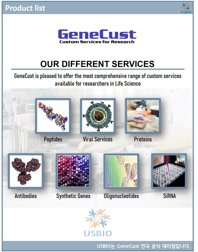 GeneCust는 생명 과학 연구자들에게 합성유전자, 올리고뉴클레오티드, SiRNA, 펩타이드, 항체, 단백질 발현, 아데노바이러스 등 포괄적인 맞춤 서비스를 제공하고 있으며, 분자 생물학, 합성 생물학 및 면역학 분야의 전문 지식을 활용하여 연구 및 개발에 지원을 하고 전 세계의 연구자들에게 맞춤형 서비스를 제공하기 위해 노력하고 있습니다.