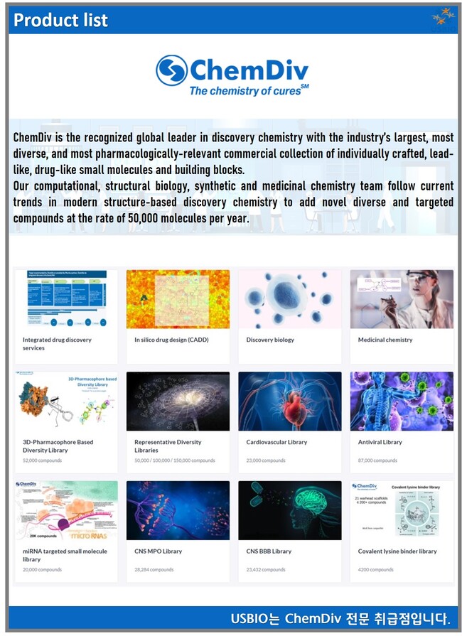어스바이오(USBIO)는 ChemDiv 공식대리점 관련 업무대행/수입 전문 취급점입니다.