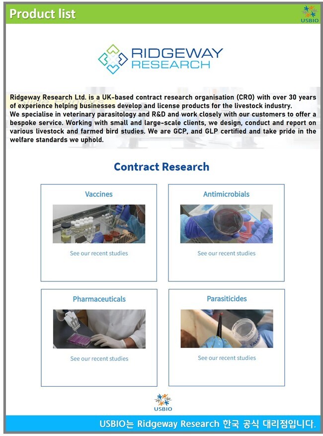Ridgeway Research(리지웨이 리서치)는 글로벌 위탁 연구 기관(CRO)으로 소, 양, 염소, 돼지, 말, 가금류 및 게임 조류를 포함한 가축 종에 대한 광범위한 연구를 제공하고 있습니다. 150개 이상의 연구를 수행했으며, 고객 중 상위 10대 글로벌 동물 건강 회사 중 다수를 포함하고 있습니다.