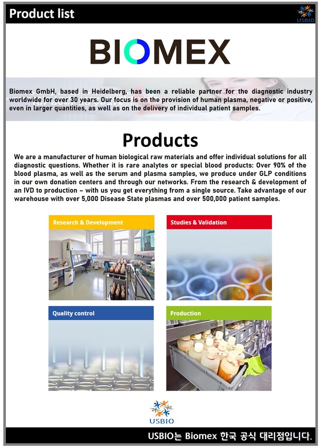 Biomex는 수 많은 테스트 시스템(면역학, 임상 화학, NAT, PoC)을 통해 원자재 이상의 것을 제공하고 있으며 더 많은 양의 인간 음성 또는 양성 혈장을 제공하고 개별 환자 샘플을 공급하는데 중점을 두고 노력하고 있습니다.