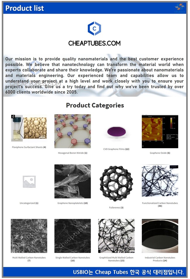 Cheap Tubes는 탄소 나노 튜브(carbon nanotube) 및 탄소 원자로 이루어진 얅은 막인 그래핀(graphene)을 공급하고 있는 업체입니다.