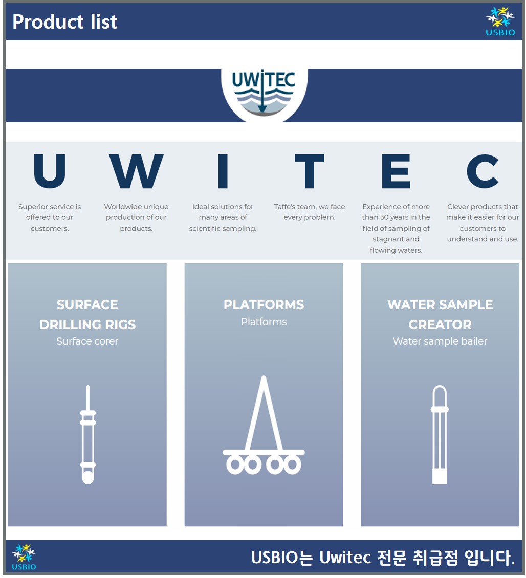 UWITEC는 과학적 목적을 위해 내수과 유수의 최상의 샘플링을 가능하게 하는 장비와 시스템을 제조 및 유통하는 업체 입니다. 해당 분야에서 30년 이상의 경험을 바탕으로 구상, 개발 및 건설에서 생산에 이르기까지 물 및 침전물 샘플링 분야에서 고객을 위한 최적의 솔루션을 만들어 내고 있습니다. UWITEC는 대규모 제품 포트폴리오 및 특별 프로젝트 외에도 전 세계적으로 장비 및 시스템을 사용한 샘플링 및 교육 형태의 서비스를 제공하고 있습니다.
