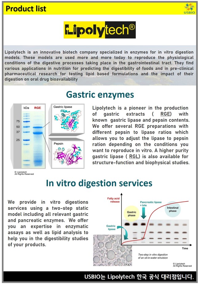 또 Lipolytech는 지방 분해 효소에 특별한 초점을 두고 소화의 위와 장 단계를 시뮬레이션하기 위한 관련 소화 효소를 제공하고 있으며 위상과 십이지장상을 포함한 2단계 정적 모델을 사용하여 체외 소화 분야에서 서비스를 제공하고 있습니다.