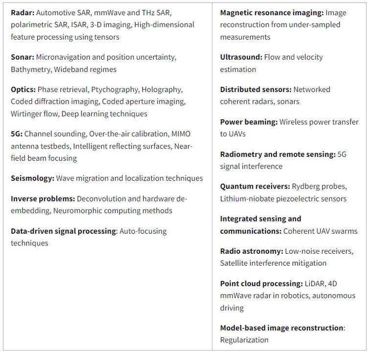 SA라는 용어는 일반적으로 더 넓은 시야각, 더 높은 각도 해상도 등 하드웨어 시스템이 본질적으로 제공할 수 있는 것보다 더 나은 이미징 또는 감지 성능을 제공하는 역문제 솔루션과 함께 개별 측정 체계를 의미합니다. SA는 synthetic aperture radar (SAR), sonar (SAS) 또는 채널 사운딩에서처럼 안테나 또는 트랜스듀서의 선형 동작을 통해 신호 영역에서 전파되는 파장 또는 환경 매개변수를 샘플링할 수 있습니다. 또는 SA는 컴퓨터 단층 촬영, 스포트라이트 SAR 또는 푸리에 사진 촬영과 같이 물체 또는 장면 주변의 다양한 시야각을 통해 K-공간 영역에서 샘플링할 수도 있습니다. 마지막으로 SA는 방사선 측정, 지진학 또는 전파 천문학에서와 같이 드문 드문 센서 배열로 구성될 수 있습니다. SA의 프런트 엔드는 기존 안테나, 음향 변환기 또는 고급 구현의 경우 리드버그 프로브와 같은 양자 센서가 될 수 있습니다. CISA는 SA 이미징 및 센싱의 모든 측면에 대한 이론적 개발, 엔지니어링 실무 및 표준화의 발전을 강조할 것입니다.