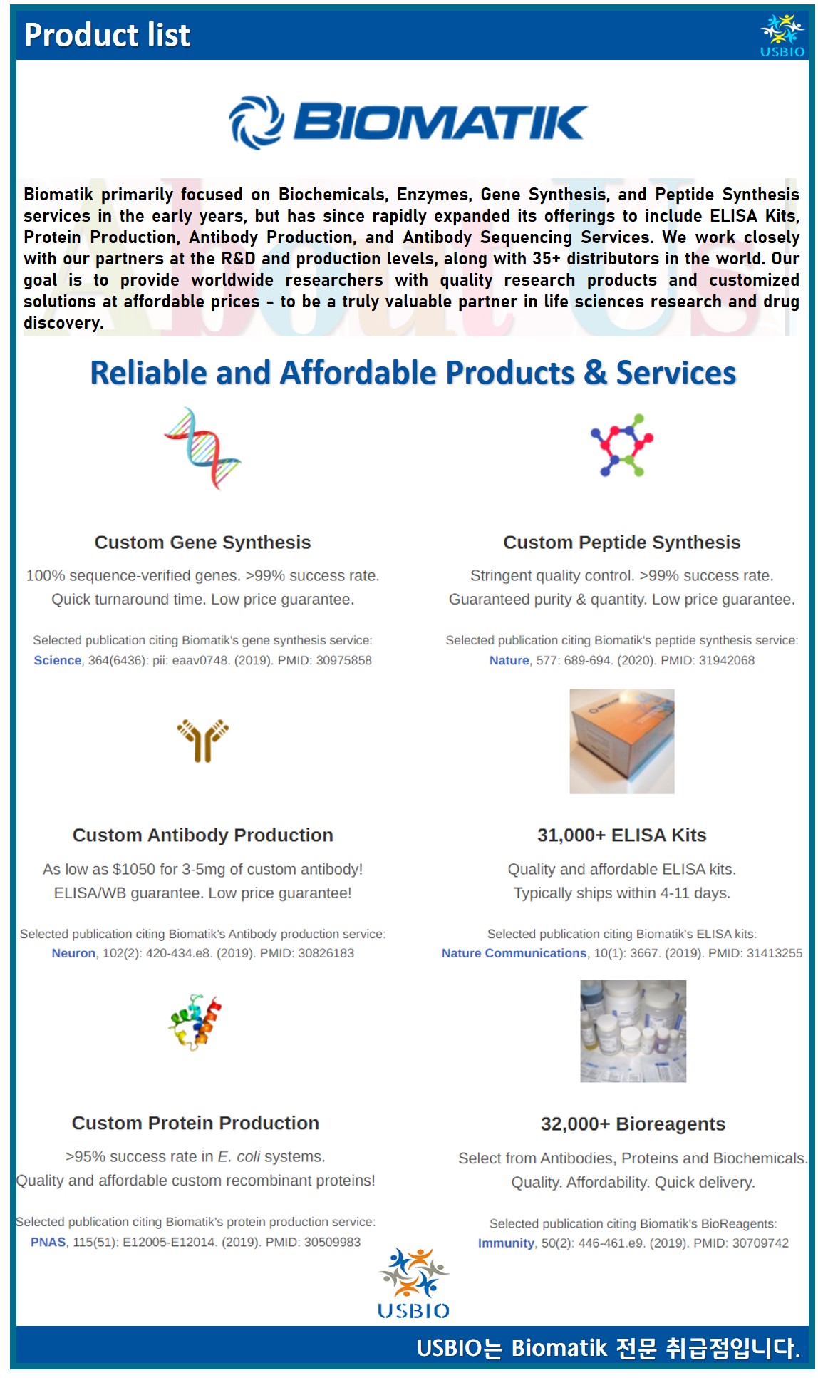 공급 가능한 제품 : 31,000 + ELISA 키트, 14,000 + 항체, 17,000 + 단백질, 260 + 생화학 물질 / 공급 가능한 서비스 : 유전자 합성, 펩타이드 합성, 단백질 발현 및 정제, 항체 생산 및 항체 시퀀싱 서비스