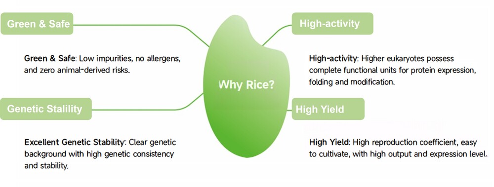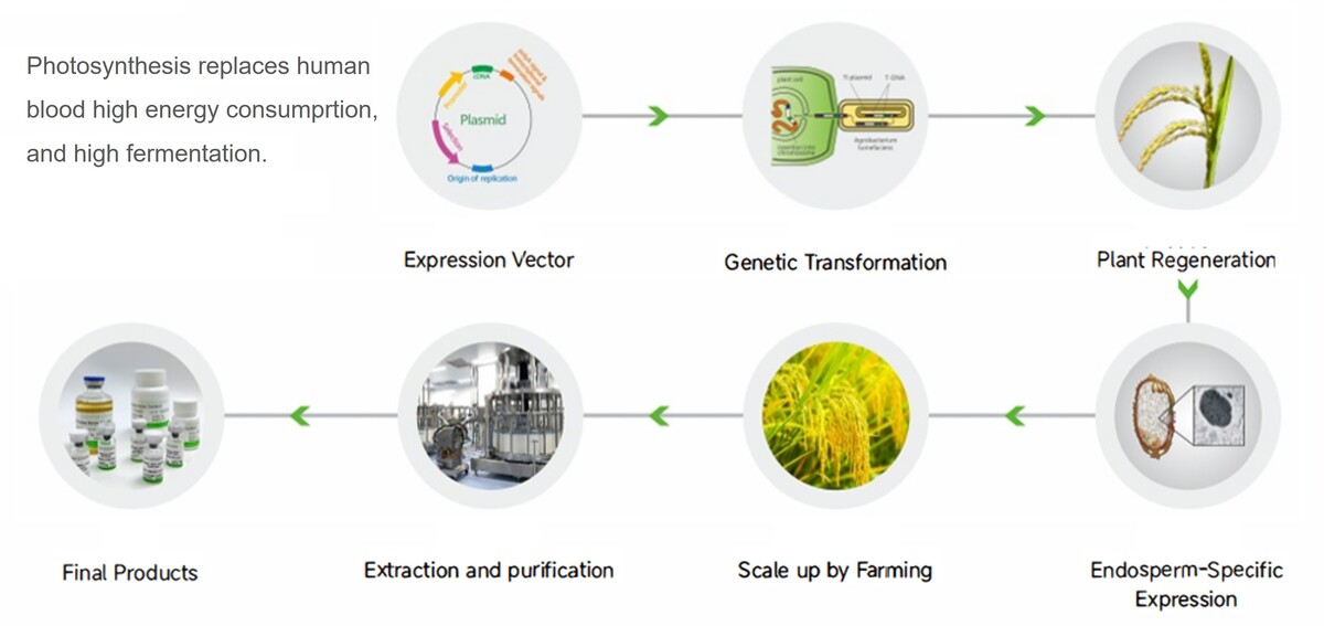 특허받은 OryzHiExP 플랫폼을 활용하여, 쌀 배유 세포(rice endosperm cells)를 바이오리액터(bioreactor)로 이용함으로써 재조합 단백질(recombinant proteins) 및 소형 펩타이드(small peptides)의 고수율(high-yield) 발현을 구현합니다. 이를 통해 생산된 OsrHSA는 쌀의 단백질 구조체(protein body) 내에 저장되어, 안정성(stability)과 생물학적 활성(bioactivity)을 최대한 유지합니다.
