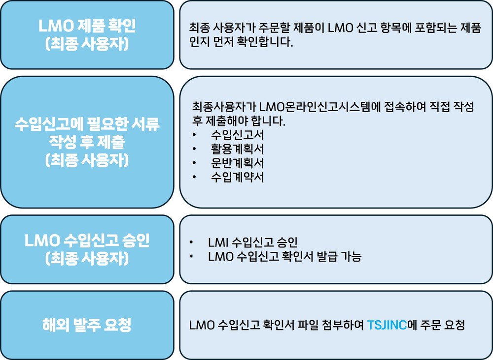- LMO 수입신고확인서 발급 후 TSJINC로 주문 요청